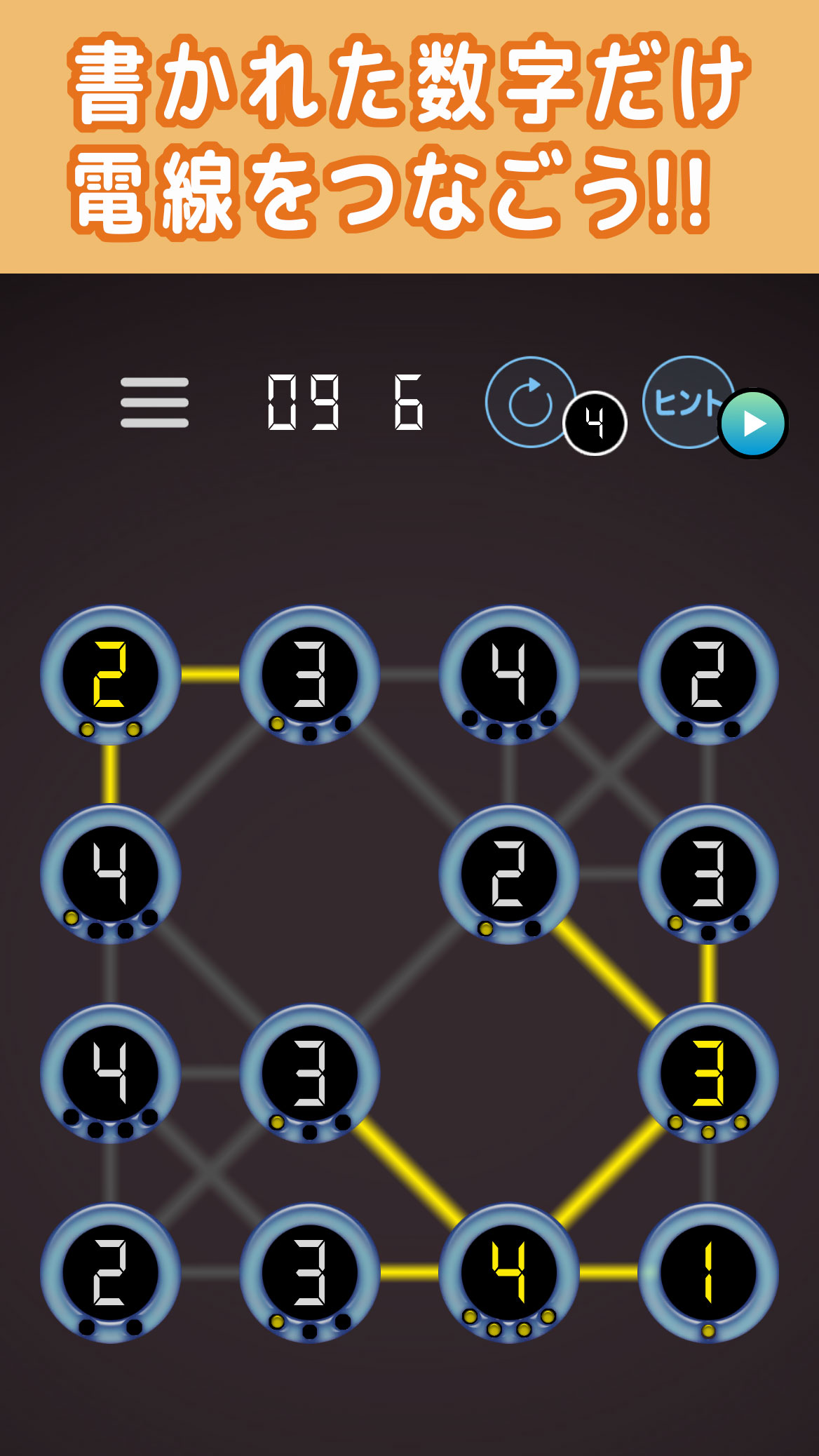 ルール リングとリングの間に電線がひかれています 1、リングに書かれた数字の分だけ電線をつなげましょう 2、重なった電線はどちらかしかつなげることはできません